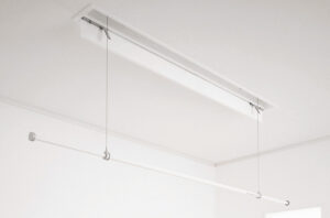 電動や手動で自由に高さ昇降ができる、天井付けタイプの物干し。