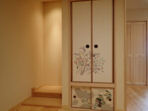 【造作棚】 襖戸に使用した刺繍は お施主様のお母様の手作り |