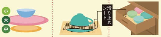 ●高く積み上げないこと、下から中皿~大皿~小皿の順に積み重ねると安定します